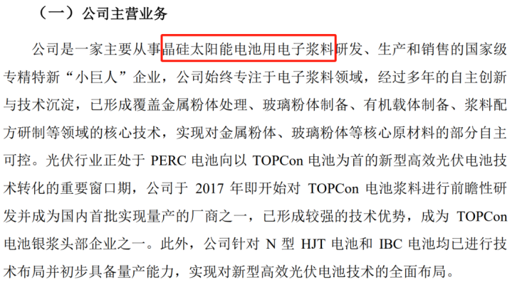 这是一个光伏产业链企业,他作念的是浆料,等于光伏的阿谁电板片需要用到这个浆料用来导电,收罗每一个电磁片内部的这些PN合髻的一些电。